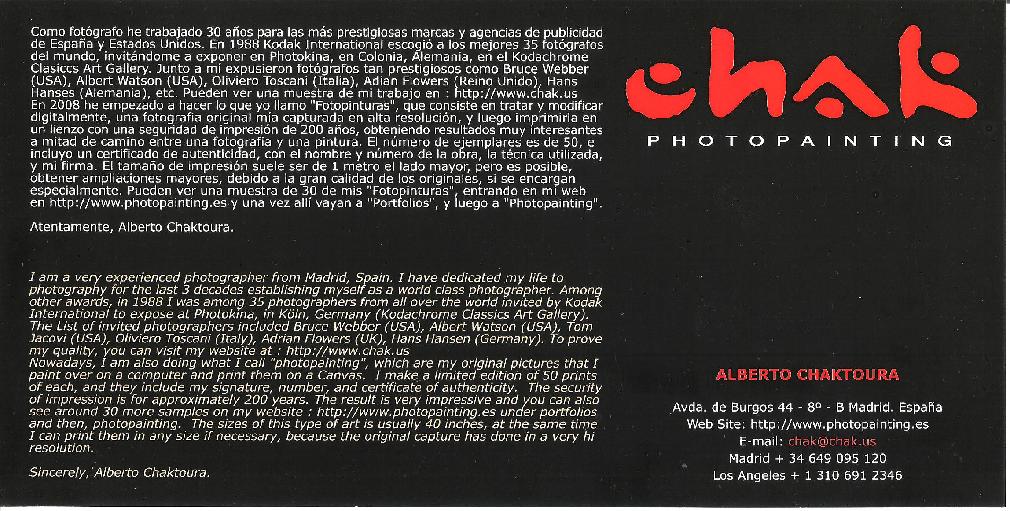 Teléfonos: + 34 649 095 120 (Madrid) + 1 310 691 2346 (Los Angeles)