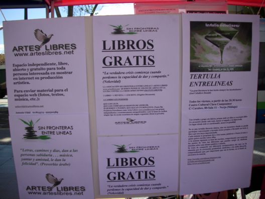 El pasado día 23 de abril, con motivo de la celebración del Día del Libro, e invitados por el Ayuntamiento de Torre del Mar (Málaga), instaló la asocición ciultural Sin Fronteras Entre Lineas un puesto literario durante todo el dia en la Plaza de la Iglesia de dicha población.